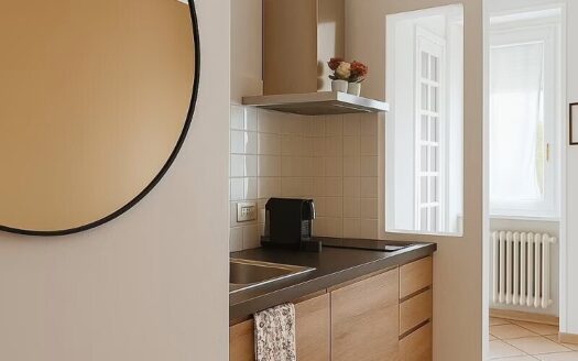 All’interno di un complesso residenziale che si sviluppa a corte, con giardino comune e box auto, si trova queste soluzione arredata.