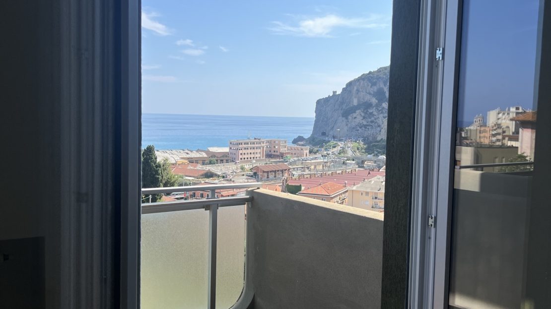 Ingresso, salone con angolo cottura con terrazzo vista mare, camera da letto con balcone vista mare e bagno, seconda cameretta con balcone e secondo servizio.